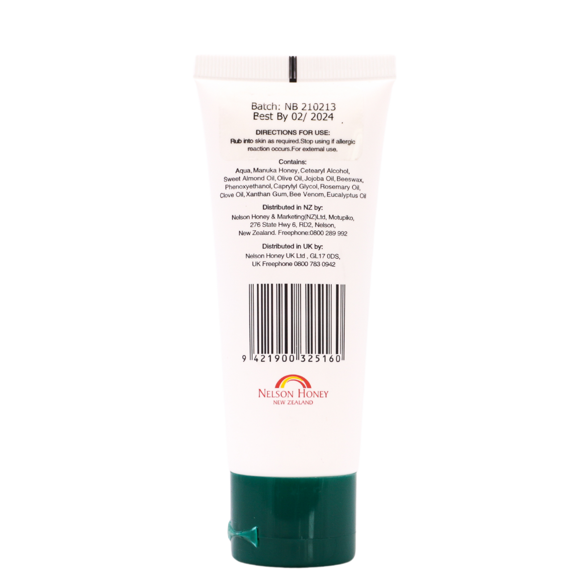 We pride ourselves on using natural ingredients where possible so your body can soak up all the natural goodness. Nectar Balm ingredients are Water, Manuka honey, Emulsifier, Sweet Almond Oil, Olive Oil, Jojoba Oil, Beeswax, Preservative, Rosemary Oil, Clove Oil, Eucalyptus Oil, Bee Venom.
