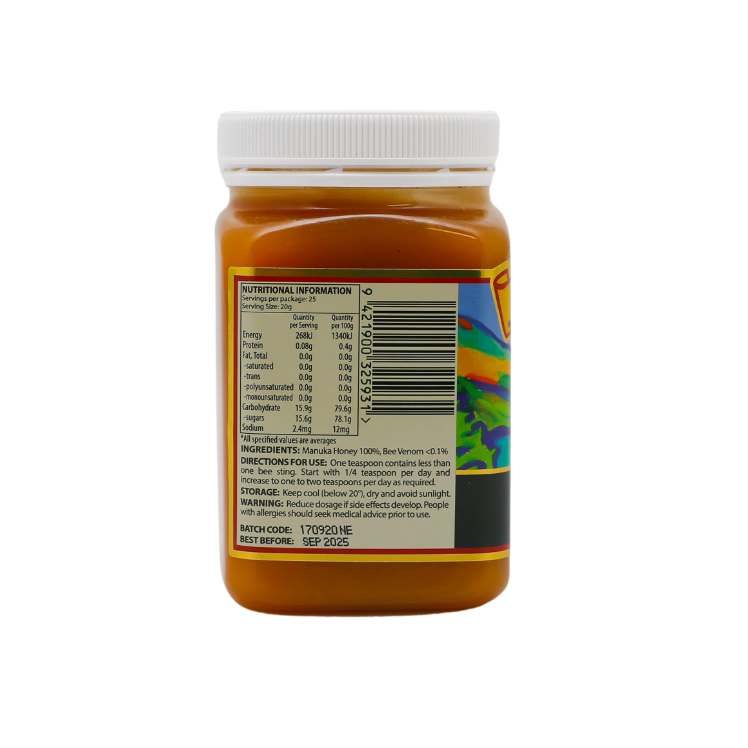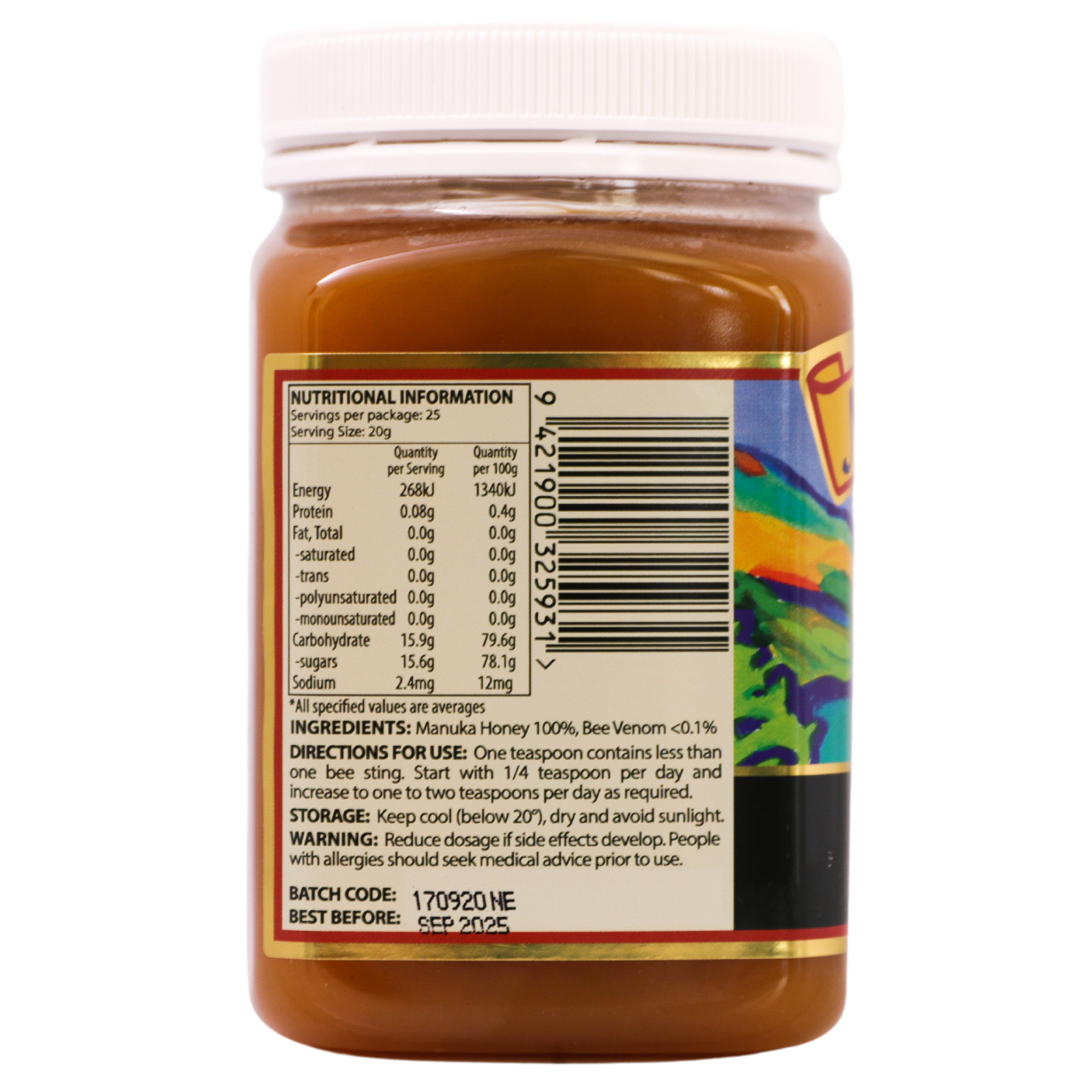 One teaspoon contains less than one bee sting. We recommend you start with 1/4 teaspoon per day and gradually increase to 1-2 teaspoons per day as required.